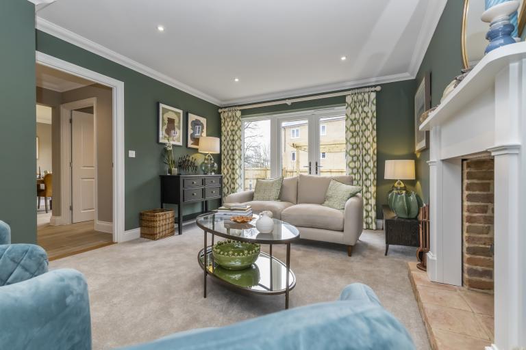The elegant living room features a striking reclaimed brick fireplace with a Hunter Herald bwood-burner, creating a warm and inviting ambiance. French doors open gracefully onto the rear garden, seamlessly blending indoor and outdoor living.