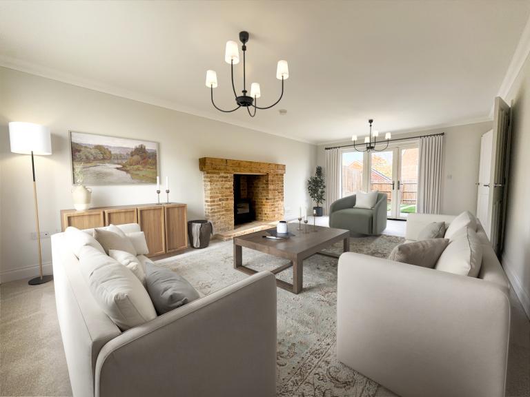 The formal living room is a statement of timeless luxury, featuring a stunning Inglenook fireplace with a Hunter Herald wood-burning stove framed by a hand-crafted oak beam — a perfect blend of classic charm and modern comfort. The spacious family area flows effortlessly into the sophisticated kitchen and dining space, where premium integrated Bosch appliances and sleek downlighting create a bright, inviting atmosphere for both everyday living and entertaining. French doors from both the living and family rooms open onto the expansive garden, inviting natural light and offering seamless indoor-outdoor living. A separate utility room provides practical convenience while maintaining the home’s polished aesthetic, and the stylish cloakroom completes the ground floor.