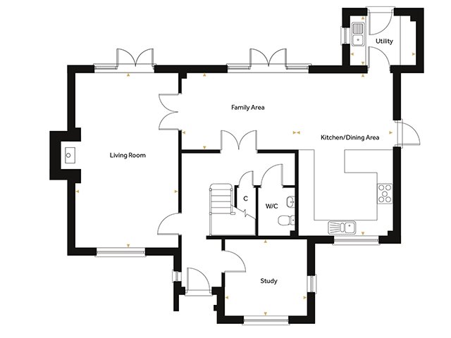 The formal living room is a statement of timeless luxury, featuring a stunning Inglenook fireplace with a Hunter Herald wood-burning stove framed by a hand-crafted oak beam — a perfect blend of classic charm and modern comfort. The spacious family area flows effortlessly into the sophisticated kitchen and dining space, where premium integrated appliances and sleek downlighting create a bright, inviting atmosphere for both everyday living and entertaining. French doors from both the living and family rooms open onto the expansive garden, inviting natural light and offering seamless indoor-outdoor living. A separate utility room provides practical convenience while maintaining the home’s polished aesthetic, and the stylish cloakroom completes the ground floor.